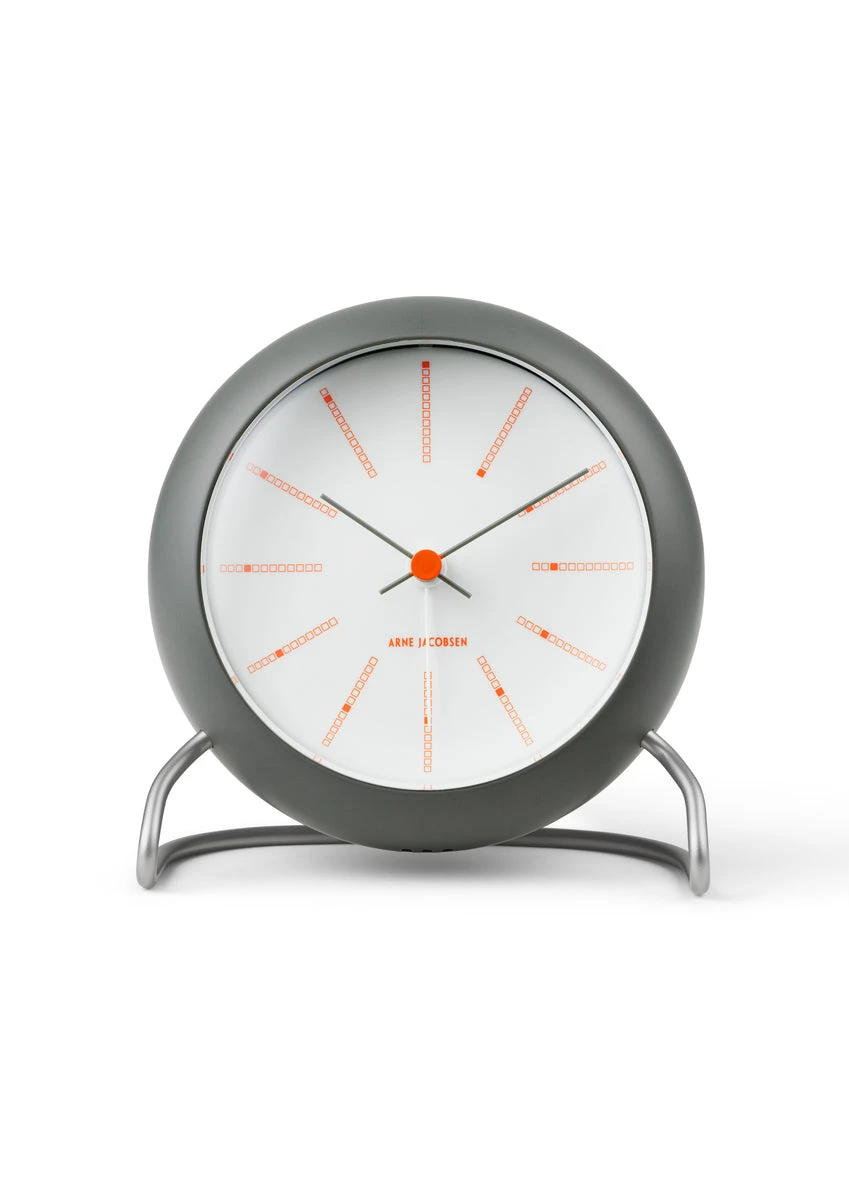 In 1971 Arne Jacobsen designed the National Bank in Copenhagen. For the beautiful marble-clad building Arne Jacobsen created the Bankers clock. The design was modern for its time and remains so today. The grey carpet surface of the clock is a tribute to Arne Jacobsen’s favourite material, the grey marble. The orange details are a modern interpretation of the red dot.