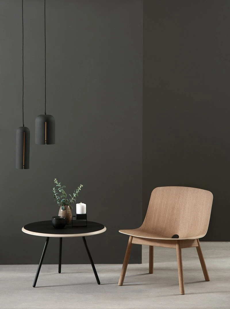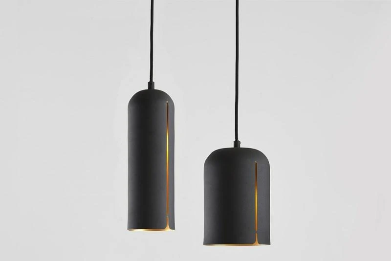 The Gap pendant combines a raw outer shell made from powder-coated metal with a feminine brass coloured inner creating a warm and cosy glow. The sleek gap in the shape lets light escape and create a graphical reflection with a golden glow from the inside. Hang the Gap pendant on its own in combination with more Gap pendants to increase to experience of the reflection.